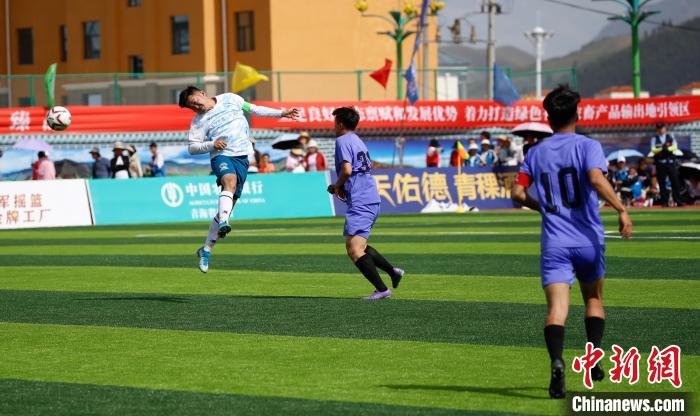 圖為海北祁連山藏羊隊(duì)隊(duì)員(白衣)在比賽中爭(zhēng)頂頭球。馬銘言 攝