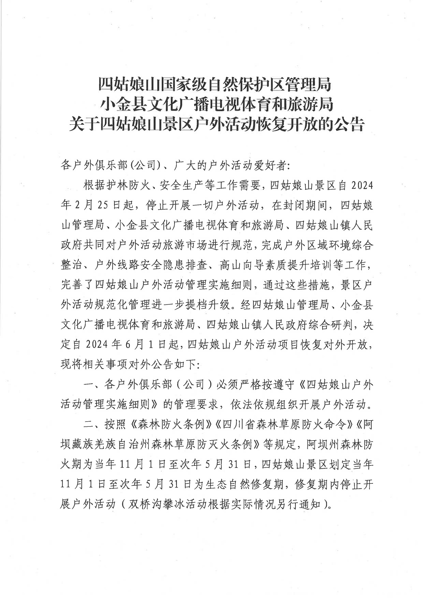 經(jīng)四姑娘山管理局、小金縣文化廣播電視體育和旅游局、四姑娘山鎮(zhèn)人民政府綜合研判,決定自2024年6月1日起,四姑娘山戶外活動項目恢復(fù)對外開放。公告要求各戶外俱樂部(公司)必須嚴格遵守《四姑娘山戶外活動管理實施細則》的管理要求,依法依規(guī)組織開展戶外活動。
