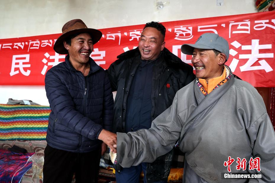 6月3日,在青海省果洛藏族自治州瑪多縣花石峽鎮(zhèn),瑪多縣人民法院“馬背法庭”的法官在牧民家中完成訴前調(diào)解。薛蒂 攝