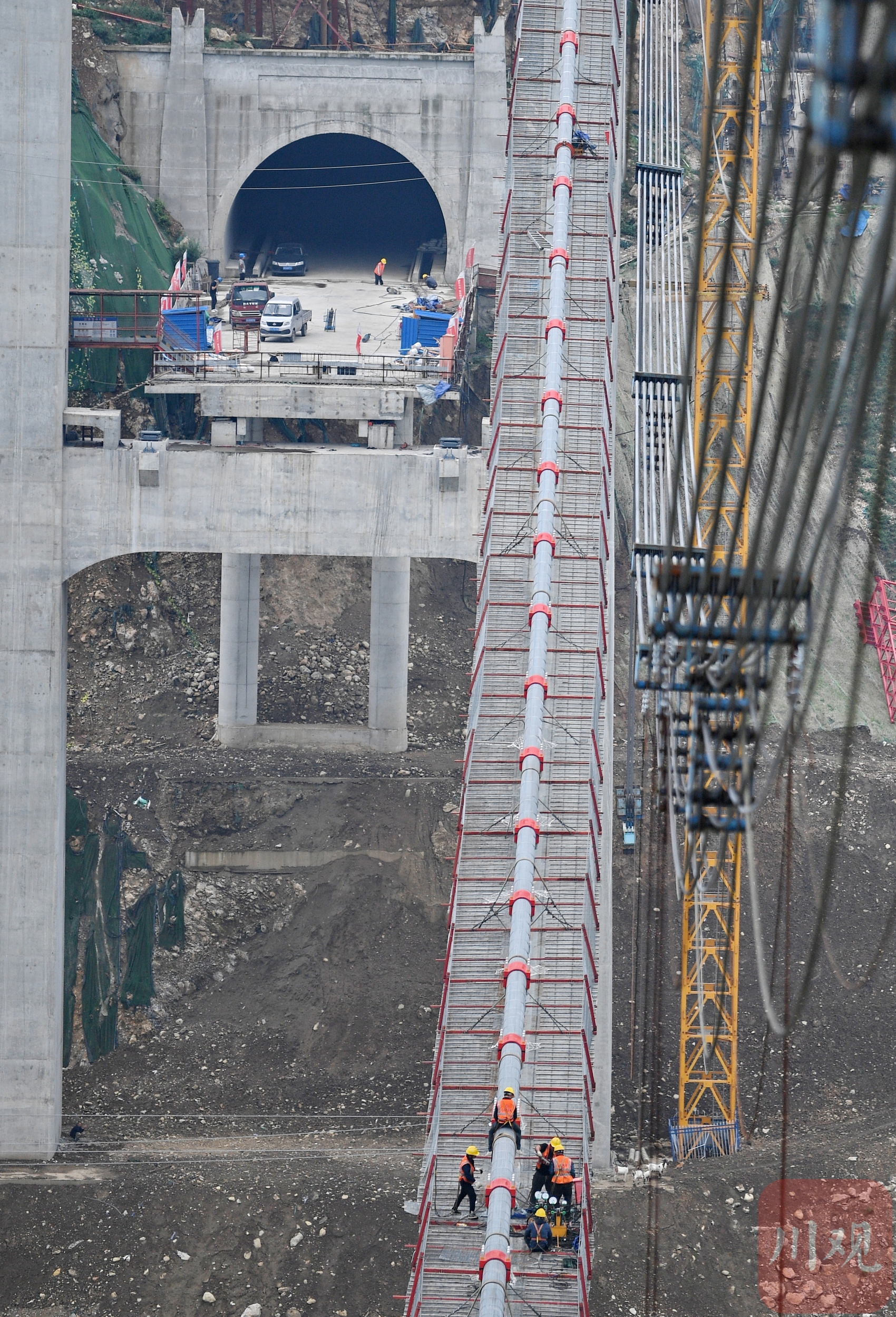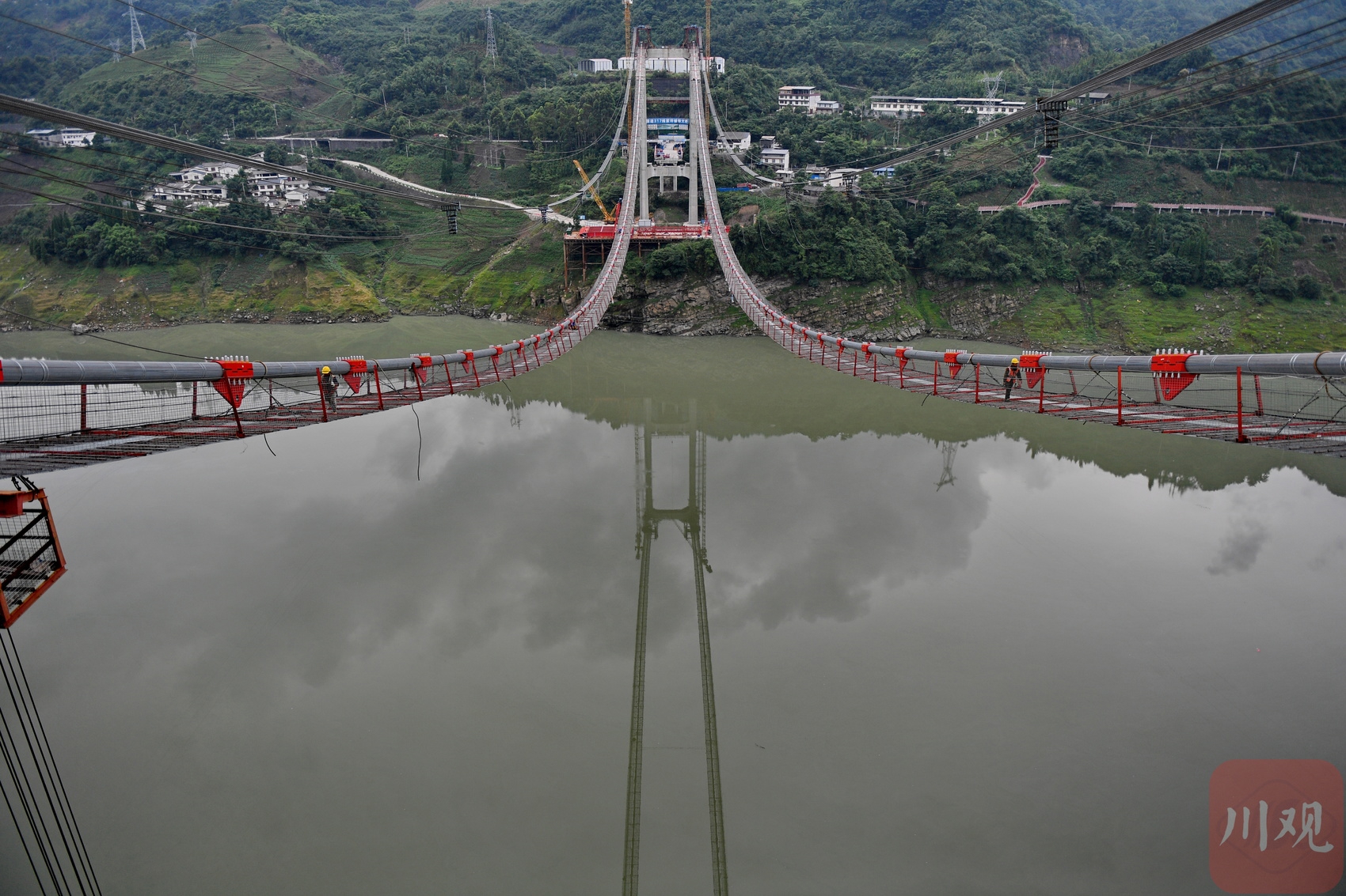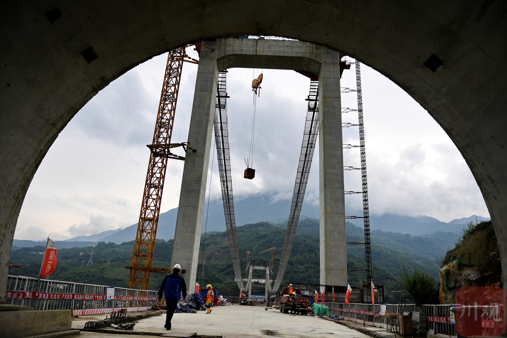 由中交路橋建設(shè)有限公司承建的國道317線友誼隧道至映秀段改建工程項目路線全長12.77公里,都江堰市境內(nèi)約0.92公里,汶川縣境內(nèi)約11.85公里。其控制性工程紫坪鋪特大橋是主跨485米橫跨岷江紫坪鋪水庫的懸索橋,為“反括弧”空間線型主纜懸索橋,是阿壩州第一座懸索橋,也是全國最大跨徑“反括弧”空間線型主纜懸索橋。其主纜上下游各設(shè)48根通長索股,單根索股長802米,每根索股由127根直徑為5.3毫米的高強鍍鋅鋼絲組成,目前已完成整個工程量的70%,預(yù)計今年主體工程完工。