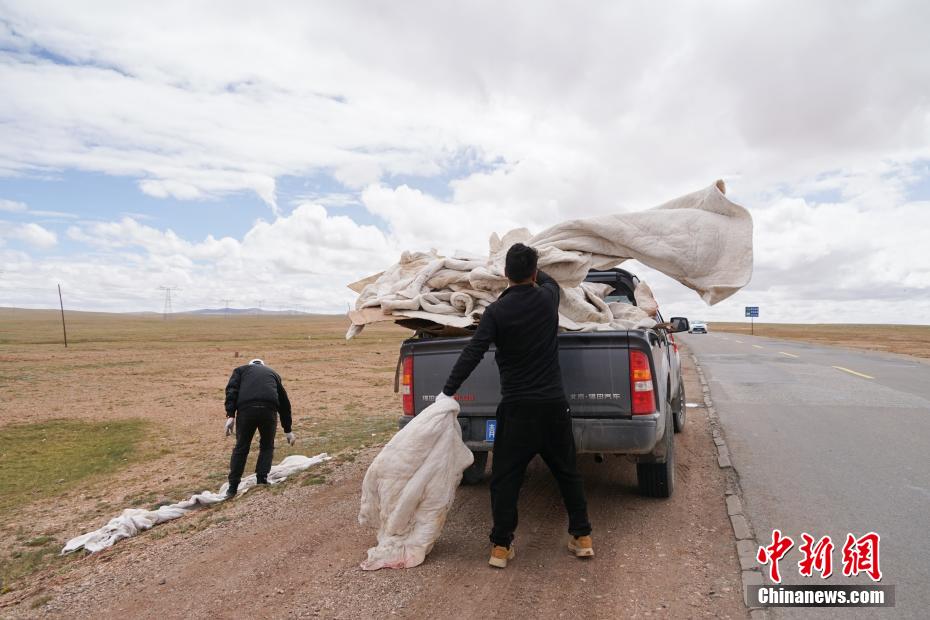 6月20日,三江源國家公園長江源園區(qū)可可西里管理處五道梁保護(hù)站2名生態(tài)管護(hù)員在青藏公路沿線撿拾垃圾。中新社記者 馬銘言 攝