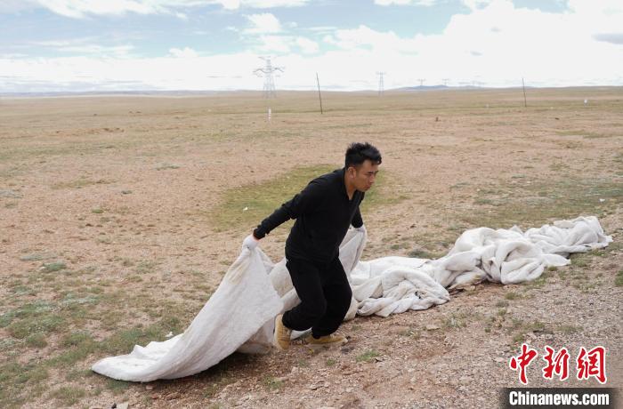 圖為可可西里管理處五道梁保護(hù)站生態(tài)管護(hù)員德尕在青藏公路沿線收集垃圾。馬銘言 攝