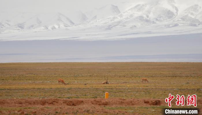 圖為可可西里藏羚羊在青藏公路一側(cè)覓食。馬銘言 攝