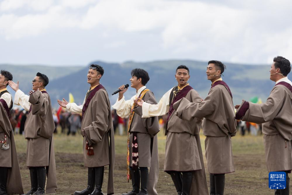 7月30日,在理塘縣多旺塘賽馬場,來自理塘縣的丁真珍珠與其他本土歌手演唱歌曲。新華社記者 江宏景 攝