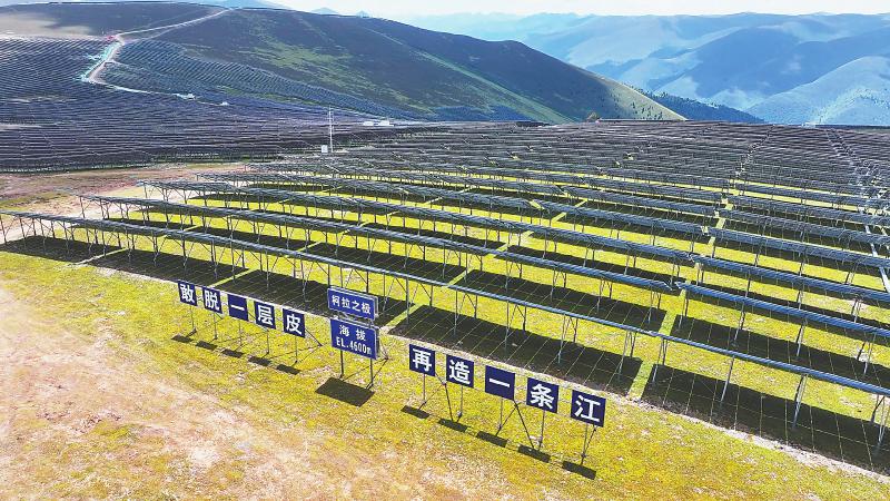 車輛行駛在扎拉托桑雪山的盤山路上,不遠處,一排排黑色長條狀的光伏板,宛如鑲嵌在山間的琴鍵,整整齊齊鋪列在綠色山體之間。登上海拔4600米的山巔,一片“光伏?!被砣怀霈F(xiàn)在眼前——這片面積約16平方公里的山間,200萬塊光伏組件鑲嵌其間。