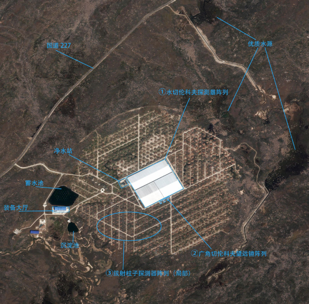 “拉索”占地面積約1.36平方公里,由地面簇射粒子探測(cè)器陣列(包含5216個(gè)電磁粒子探測(cè)器和1188個(gè)繆子探測(cè)器)、水切倫科夫探測(cè)器陣列(面積約78000平方米)和廣角切倫科夫望遠(yuǎn)鏡陣列(18臺(tái))組成,采用四種探測(cè)技術(shù),可全方位、多變量測(cè)量來(lái)自高能天體的伽馬射線和宇宙線。