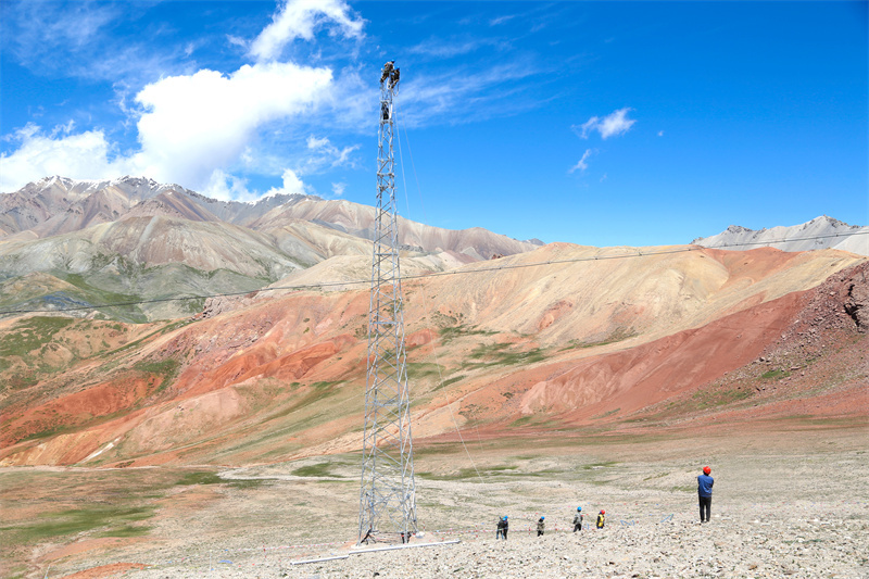 團結峰下,國網青海省電力公司輸電專業(yè)施工人員正在開展蘇里35千伏輸變電工程組塔安裝工作。許小萍 攝