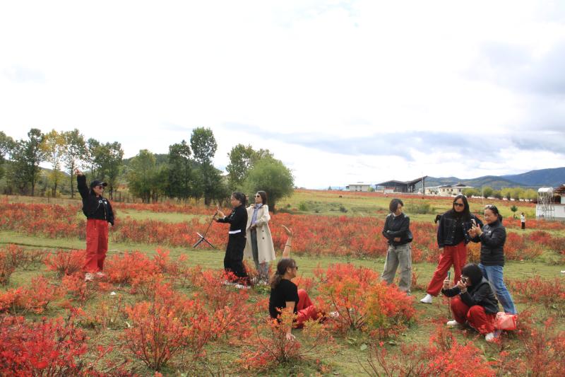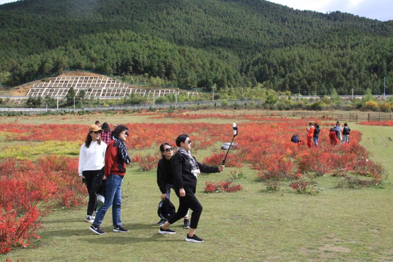 連日來(lái),香格里拉迎來(lái)狼毒最佳觀賞期,眾多國(guó)內(nèi)外游客被草原上一片片火紅的狼毒所吸引,紛紛駐足觀賞。圖為游客在香格里拉市小中甸草原賞狼毒、拍照留影。