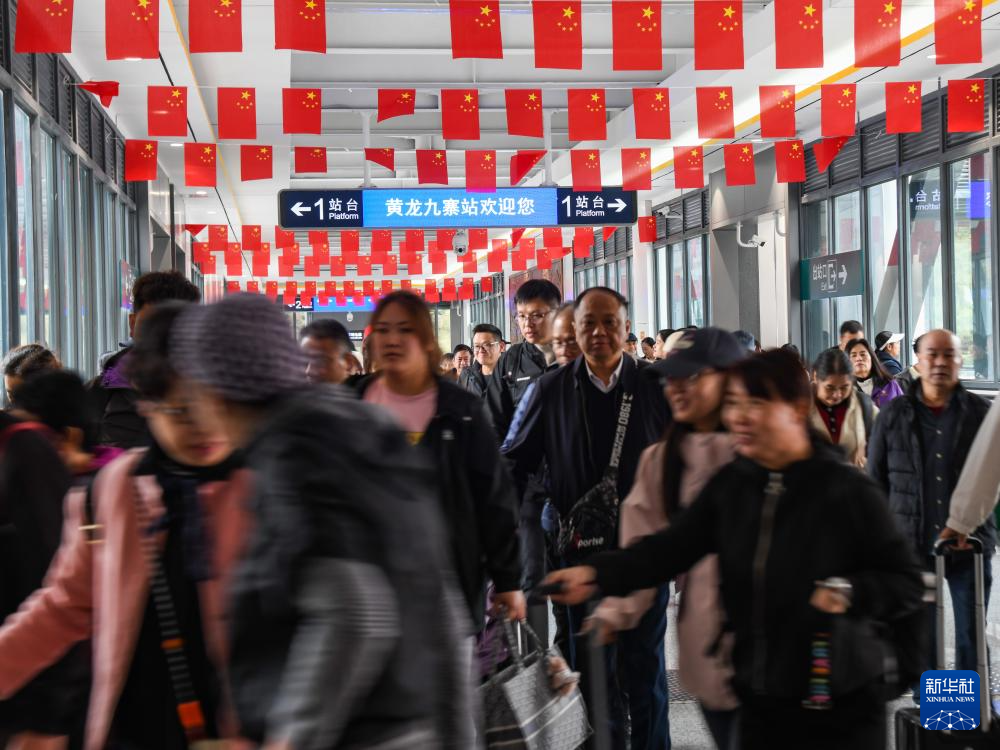 10月9日,游客到達(dá)川青鐵路黃龍九寨站。新華社記者 王曦 攝