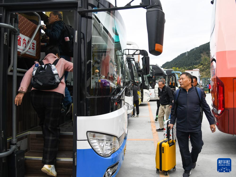 10月9日,游客在黃龍九寨站外乘坐通往景區(qū)的接駁車(chē)。新華社記者 王曦 攝