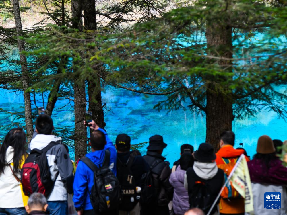 10月10日,游客在九寨溝景區(qū)五彩池觀光游覽。新華社記者 王曦 攝