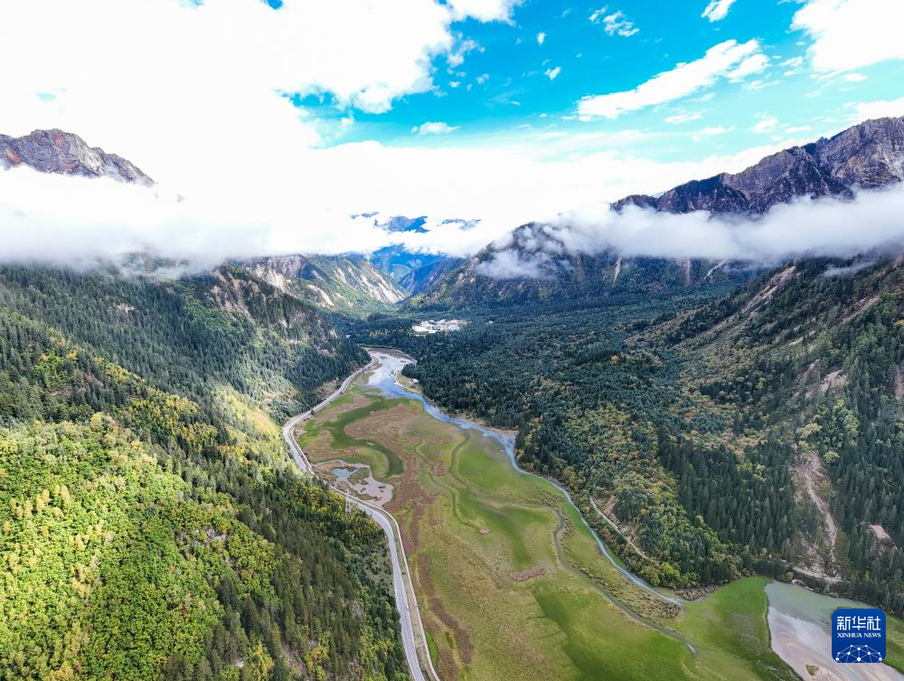 這是10月12日拍攝的九寨溝縣愛(ài)情海景區(qū)內(nèi)的高山濕地(無(wú)人機(jī)照片)。新華社記者 王曦 攝