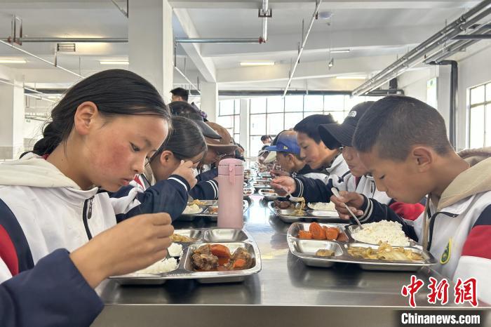近日,色達縣中學(xué)東校區(qū),學(xué)生們在食堂用餐。中新社記者 王鵬 攝