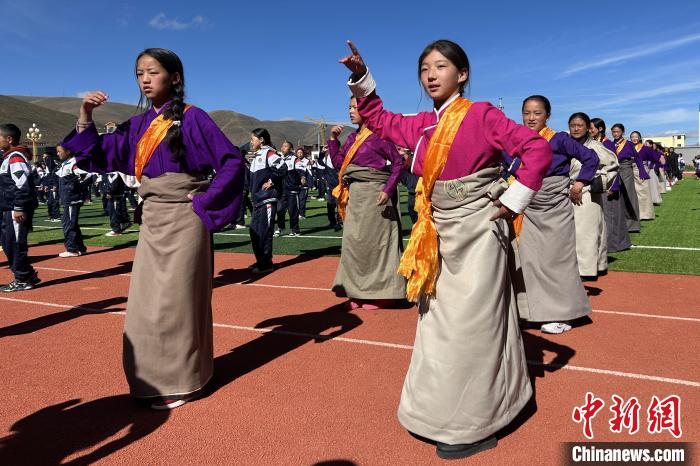 近日,色達縣中學(xué)東校區(qū),學(xué)生們在跳藏族鍋莊舞。中新社記者 王鵬 攝