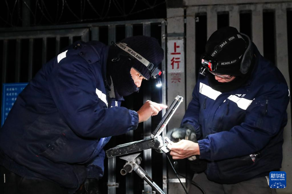 1月13日晚,在新烏鞘嶺隧道通道門外,兩名線路工組裝鐵路軌道檢查儀。新華社記者 郎兵兵 攝
