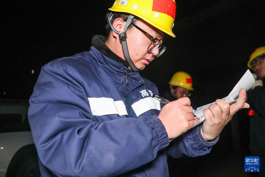 1月13日晚,在新烏鞘嶺隧道通道門外,“95后”橋隧工工長金炻正在清點(diǎn)工具材料。新華社記者 郎兵兵 攝