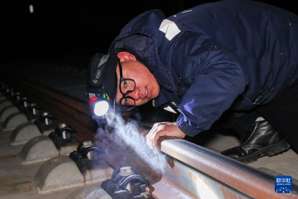 1月14日凌晨,在新烏鞘嶺隧道口,“00后”線路工張玉華趴在線路上查看軌道平整度。新華社記者 郎兵兵 攝