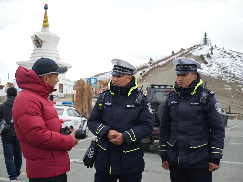 從海拔2500多米的康定城區(qū)出發(fā),沿盤山公路駛向山口。挺拔的松柏變?yōu)榈桶墓嗄?,最后是枯黃的草甸。海拔4298米,車子終于掙扎著爬完最后一個S彎,記者的手表提示“血氧飽和度79,嚴(yán)重高反”。一座孤零零的警務(wù)站出現(xiàn)在眼前:一幢低矮的石砌二層藏式建筑,屋檐下壘著十幾袋融雪劑,除冰鏟整齊倚墻,地上還有七八條粗細(xì)不一的鋼繩。