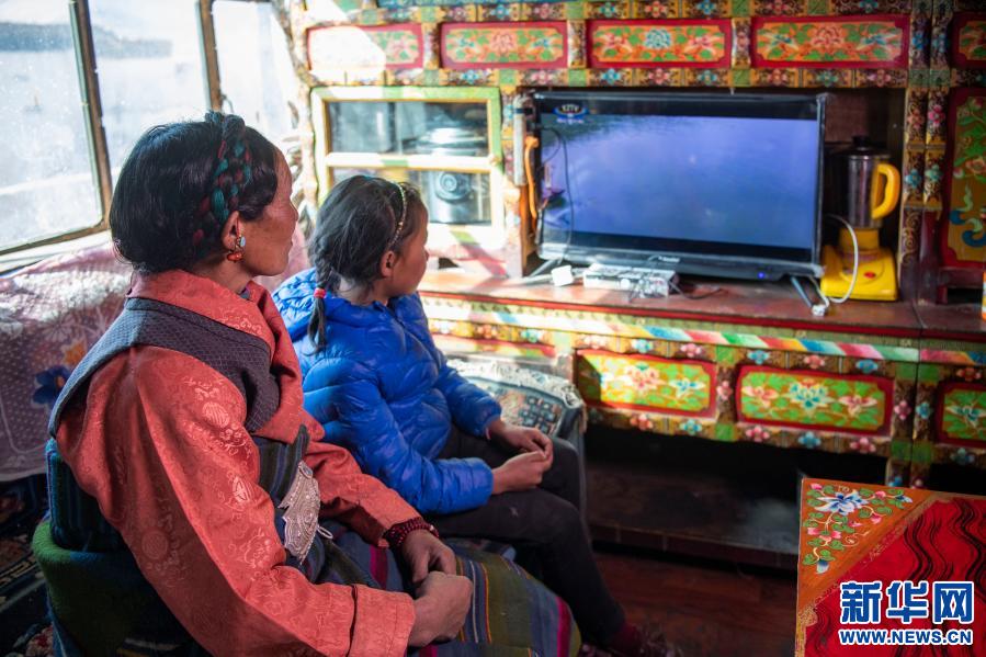 西藏日喀則市定日縣扎西宗鄉(xiāng)托桑林村村民格桑(左)和女兒在看電視(2020年1月20日攝)。 新華社記者孫非 攝