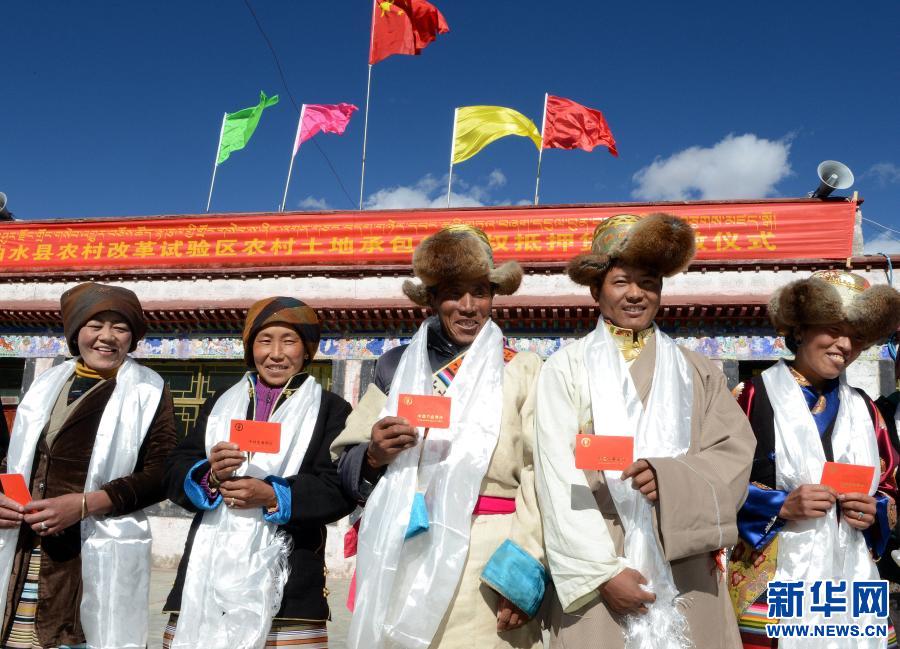 西藏拉薩市曲水縣才納鄉(xiāng)白堆村農(nóng)民展示貸款證(2015年4月17日攝)。新華社記者 覺果 攝