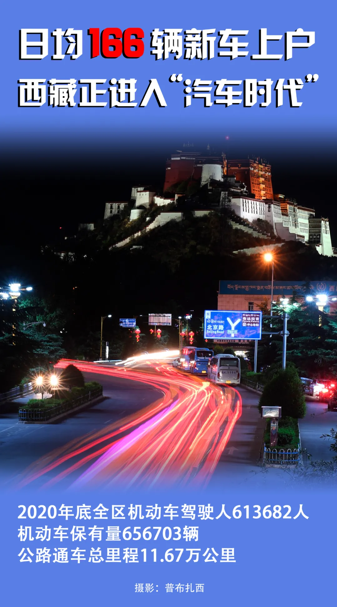 2020年,日均新車(chē)上戶166輛;截至當(dāng)年底,西藏機(jī)動(dòng)車(chē)保有量達(dá)到656703輛,機(jī)動(dòng)車(chē)駕駛?cè)诉_(dá)613682人。西藏公路通車(chē)總里程達(dá)到11.67萬(wàn)公里。按照目前拉薩戶籍人口55萬(wàn)人計(jì)算,基本上平均每?jī)蓚€(gè)人就擁有一輛車(chē)。
