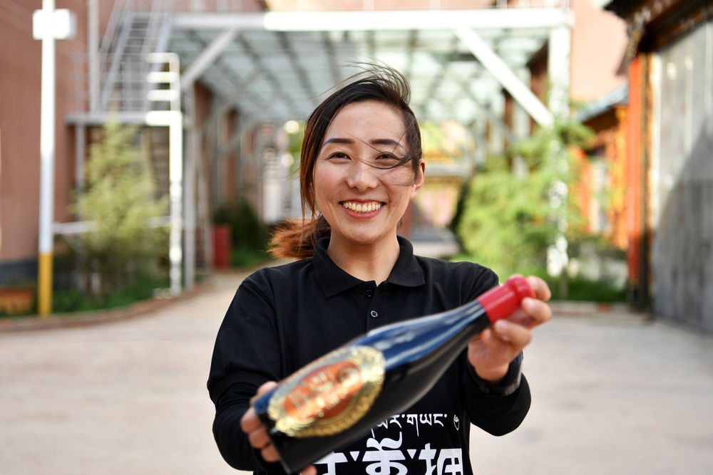 西藏芒康縣藏東珍寶酒業(yè)有限公司副總經(jīng)理曲措在展示一款“達(dá)美擁”葡萄酒(2020年5月4日攝)。新華社記者 詹彥 攝