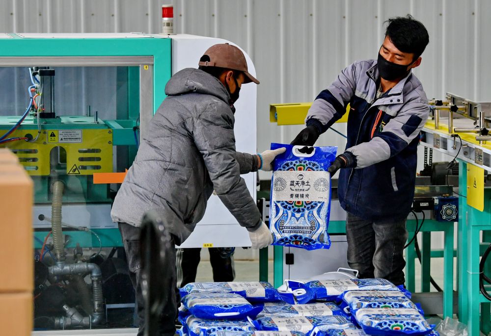 在日喀則德琴3900莊園有限公司,企業(yè)員工索朗平措(左)和倫珠加措擺放袋裝青稞米(2020年3月6日攝)。新華社記者 張汝鋒 攝
