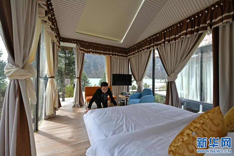 然烏國(guó)際自駕·房車(chē)露營(yíng)營(yíng)地是西藏昌都市八宿縣招商引資的旅游產(chǎn)業(yè)扶貧項(xiàng)目,2018年3月正式營(yíng)業(yè)。圖為一名營(yíng)地工作人員在湖邊的星空房?jī)?nèi)整理房間(2019年5月24日攝)。新華社記者 李鑫 攝