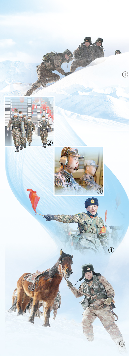 圖①、圖⑤:1月下旬,南疆軍區(qū)某邊防團在高原巡邏。