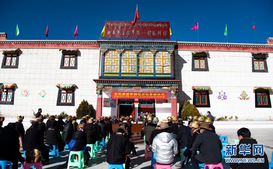 2月9日,西藏自治區(qū)供銷合作社社有企業(yè)——西藏領(lǐng)峰田舍益家公司負責(zé)人趙全(左一)給當(dāng)?shù)厝罕姲l(fā)放分紅。新華社記者 普布扎西 攝