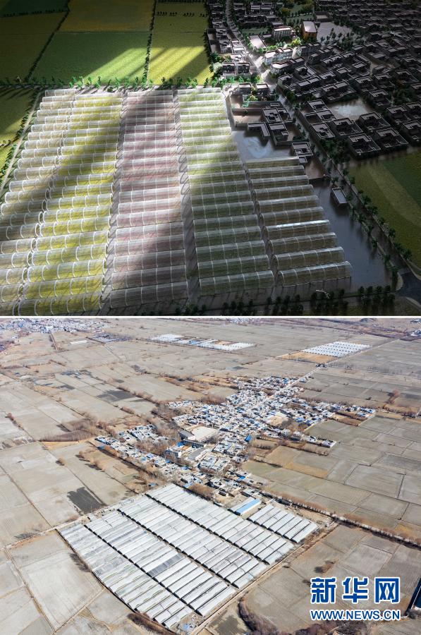 拼版照片:上圖是西藏山南市乃東區(qū)克松村社區(qū)農(nóng)業(yè)產(chǎn)業(yè)生產(chǎn)基地規(guī)劃圖(2月9日攝);下圖是克松村社區(qū)農(nóng)業(yè)產(chǎn)業(yè)生產(chǎn)基地(2月9日攝,無人機照片)。新華社記者 普布扎西 攝