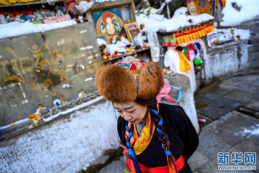 2月12日,在西藏自治區(qū)山南市乃東區(qū)澤當(dāng)鎮(zhèn),格央和父母一起,在藏歷新年第一天轉(zhuǎn)山祈福。這是格央在等待取“吉祥水”。新華社記者 劉金海 攝