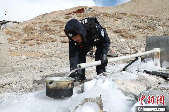 珠峰大本營(yíng)執(zhí)勤點(diǎn)民警正在取水做飯。彭維熙 攝