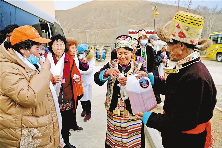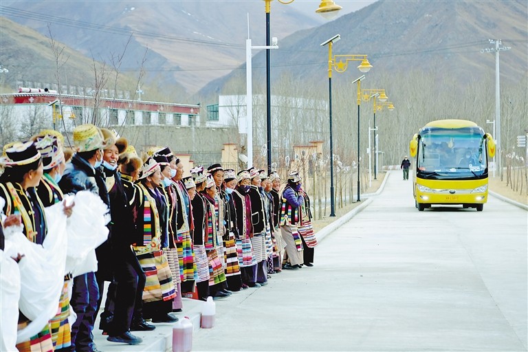 強(qiáng)吉村村民迎接游客。倫珠次仁 記者 洛桑 攝