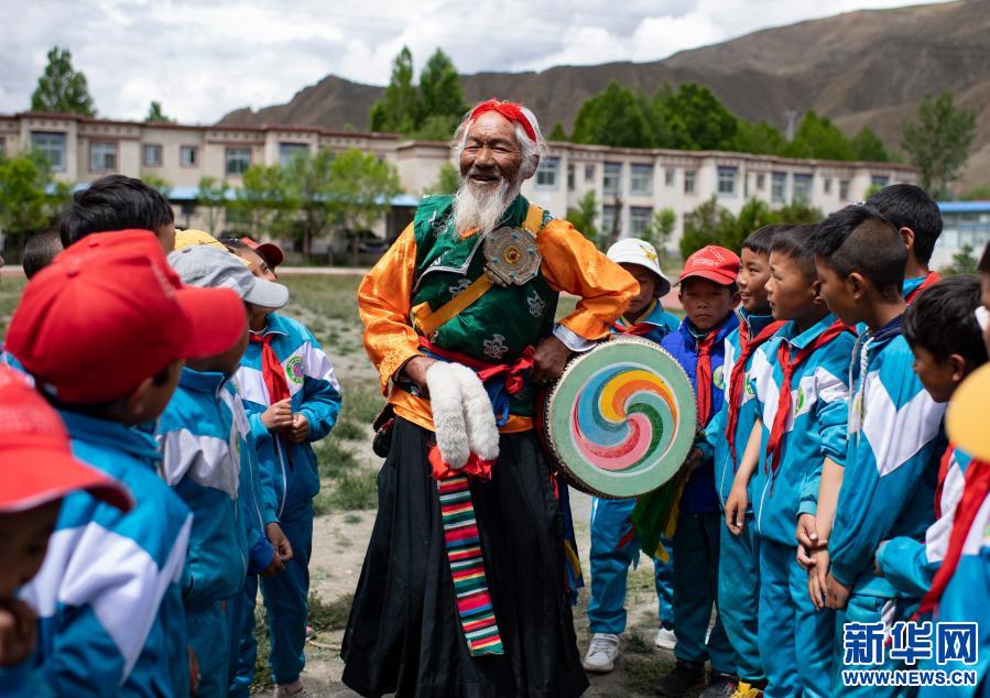 “久河卓舞”傳承人尼瑪(中)在瓊結(jié)縣下水鄉(xiāng)小學進行教學表演前的準備工作(2020年7月2日攝)。新華社記者 普布扎西 攝