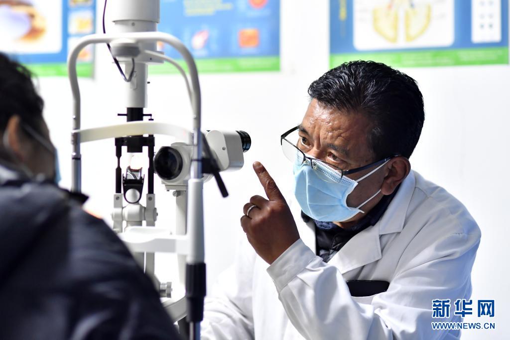3月24日,西藏拉薩光明眼科康復(fù)診療院醫(yī)生對(duì)白內(nèi)障患者進(jìn)行檢查。新華社記者 覺(jué)果 攝