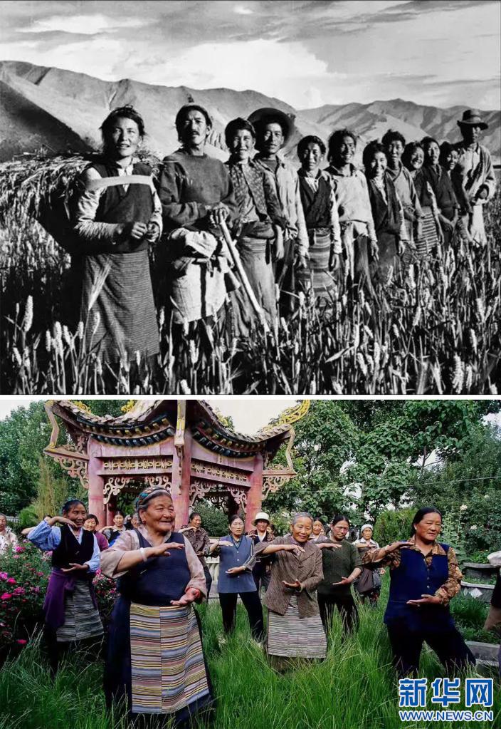 拼版照片:上圖:次仁拉姆(左一)和互助組成員在田間勞作(資料照片)。下圖:次仁拉姆(左前)在社區(qū)居委會里學(xué)習太極拳(新華社發(fā) 車剛 攝)新華社發(fā)