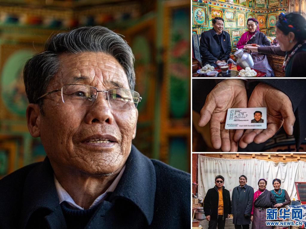 這是一張拼版照片,左圖為昂旺尼瑪?shù)男は?;右上圖為家人為昂旺尼瑪(右)倒甜茶;右中圖為昂旺尼瑪?shù)纳矸葑C;右下圖為昂旺尼瑪(中)和家人在家門前合影留念(照片均為2月18日新華社記者孫非攝)。新華社發(fā)