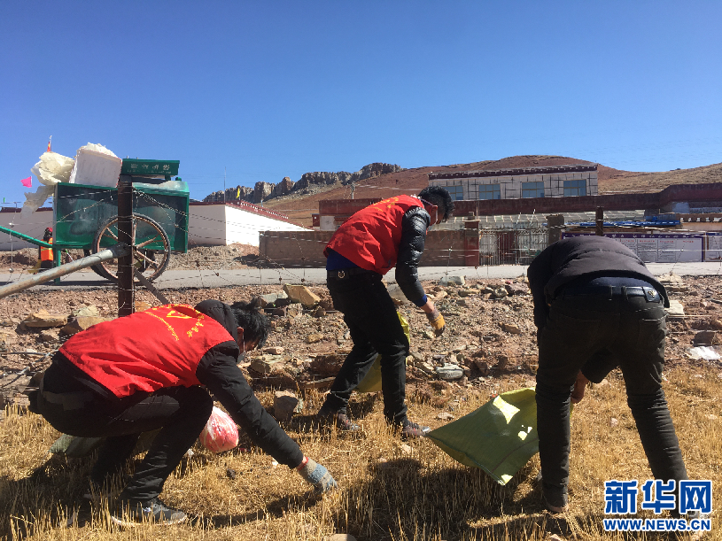 區(qū)黨校駐村工作隊組織在家牧民黨員在學(xué)校、廣場、村委會等場所集中清理生活垃圾和建筑垃圾(4月29日攝)。新華網(wǎng)發(fā) 王煦樟攝