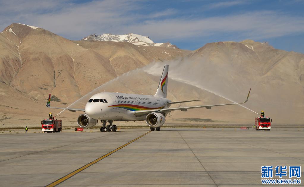 2020年7月1日,阿里昆莎機(jī)場(chǎng)通航10周年,飛機(jī)穿過水門。新華社記者田金文 攝