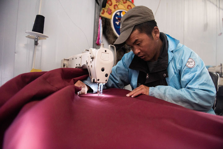 走進(jìn)廠房,只能聽見縫紉機(jī)轉(zhuǎn)動的聲音。平措占堆坐在縫紉機(jī)前,雙眼盯著跳動的針頭,手推深紅色布料伸展開去,這是制作藏式門簾的步驟之一。