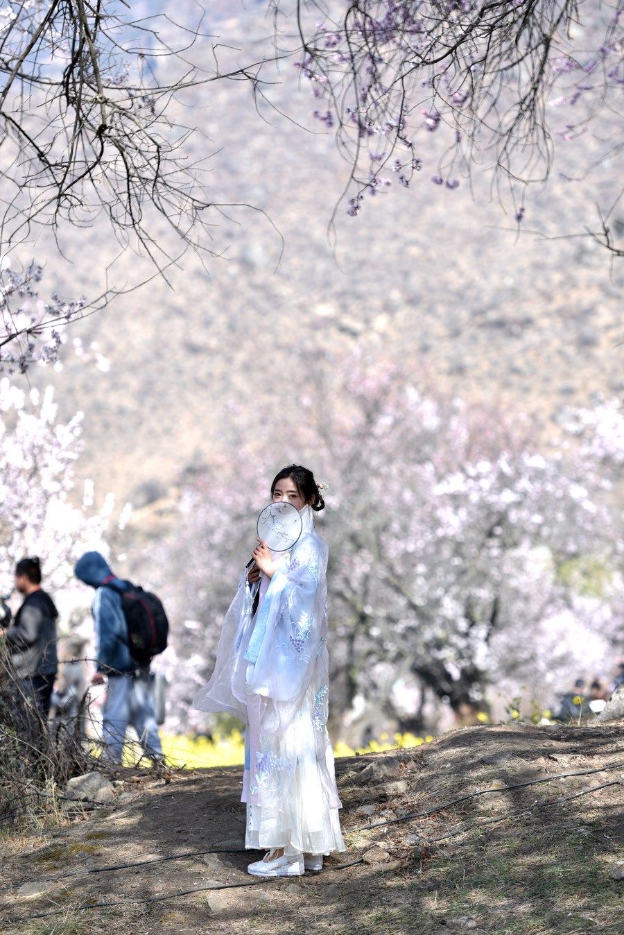 2021年林芝桃花旅游文化節(jié)期間,一名身穿古裝的姑娘在欣賞桃花。新華社記者 田金文 攝