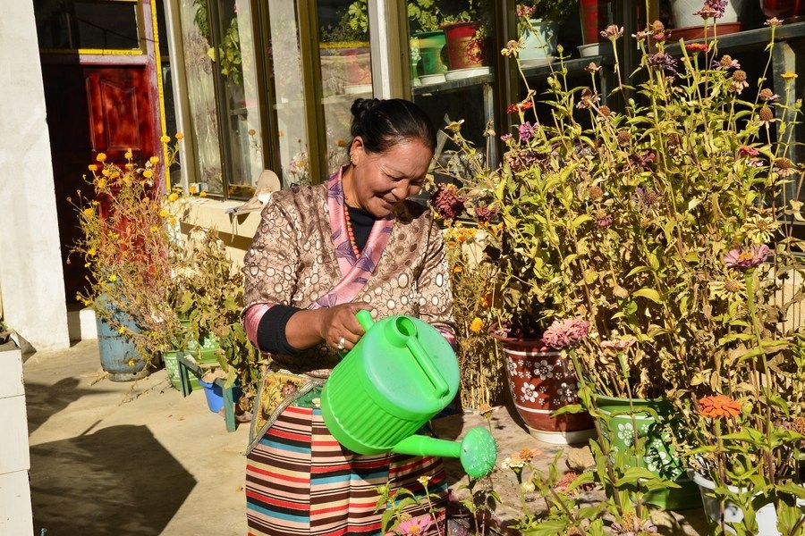 阿里地區(qū)札達(dá)縣札布讓村村民金珠德吉在院子里澆花。新華社記者 田金文 攝