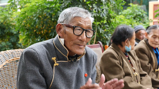 阿里地區(qū)老人護理院老人 拉松(藏語):護理員們經(jīng)常給我們洗頭、洗澡、剪指甲,就像對待自己的親生父母一樣照顧我們,不嫌臟。好吃好喝都有,平時還可以跟其他老人一起玩玩骰子、打打撲克,很開心、很快樂,這都是國家的恩惠。