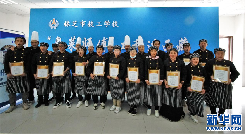 “粵菜師傅”培訓(xùn)班學(xué)員與培訓(xùn)導(dǎo)師合影。林芝市人力資源和社會(huì)保障局供圖