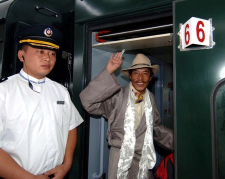 2006年7月1日,第一位檢票登車的乘客——來自拉薩柳梧鄉(xiāng)的達(dá)瓦桑布——登上慶典列車后向站臺上的人們揮手。