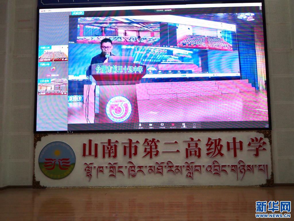 西藏山南市第二高級中學的學生坐在階梯教室中,屏幕的另一端是安徽省合肥市第三十五中學的同學們。借助網絡傳輸技術,皖藏兩地實現思政課教學資源跨越上千公里的互聯共享,創(chuàng)新了思政課的形式。