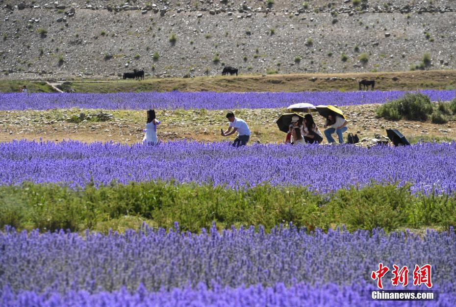 6月25日,位于西藏自治區(qū)拉薩市達(dá)孜區(qū)新倉村貝拉莊園的100畝薰衣草花海競相綻放,吸引不少游客和當(dāng)?shù)厥忻袂皝碛瓮?、拍照。中新社記?貢嘎來松 攝