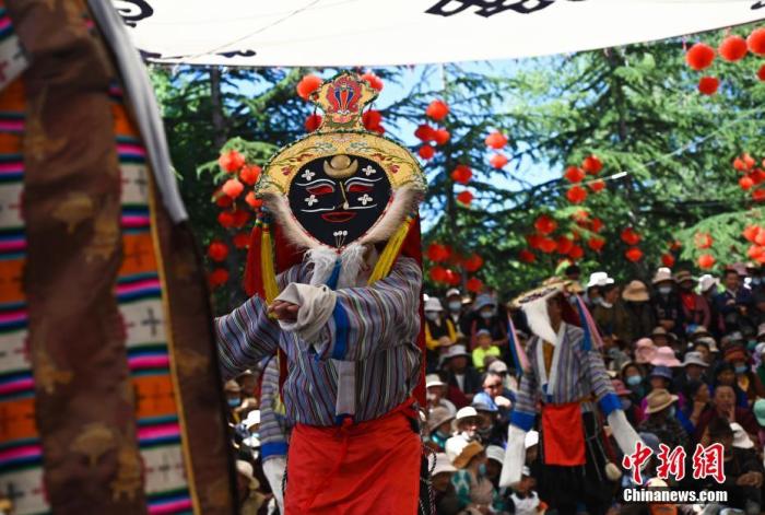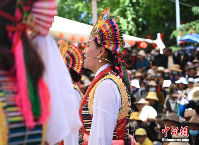 圖為6月26日,拉薩城關區(qū)次角林藏戲隊演員正在進行表演。中新社記者 趙朗 攝