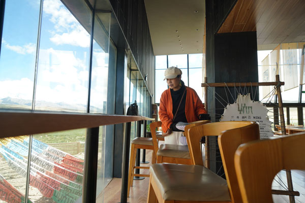 從正門進(jìn)入,穿過(guò)牦牛文化空間走廊,便可到能夠以最佳視角欣賞念青唐古拉山的VR觀景臺(tái)。緊鄰觀景臺(tái)右側(cè),是一間擺放當(dāng)?shù)匚膭?chuàng)產(chǎn)品、各類書(shū)籍的觀景咖啡廳。該咖啡廳的兩面墻體設(shè)計(jì)為超大落地窗,在此休息的游客可以邊品嘗咖啡,邊欣賞念青唐古拉山及拉多草原的美景。走進(jìn)咖啡廳,記者看到不少在這里休息的游客都在低頭寫著什么,經(jīng)咖啡廳負(fù)責(zé)人介紹:“這些游客是在寫明信片,我們這里不僅提供餐飲,還提供印有本地風(fēng)景的明信片,并同中國(guó)郵政合作,幫助游客按時(shí)將明信片寄到他們的親朋好友手中,讓游客們的旅途變得更有意義?!?/p>